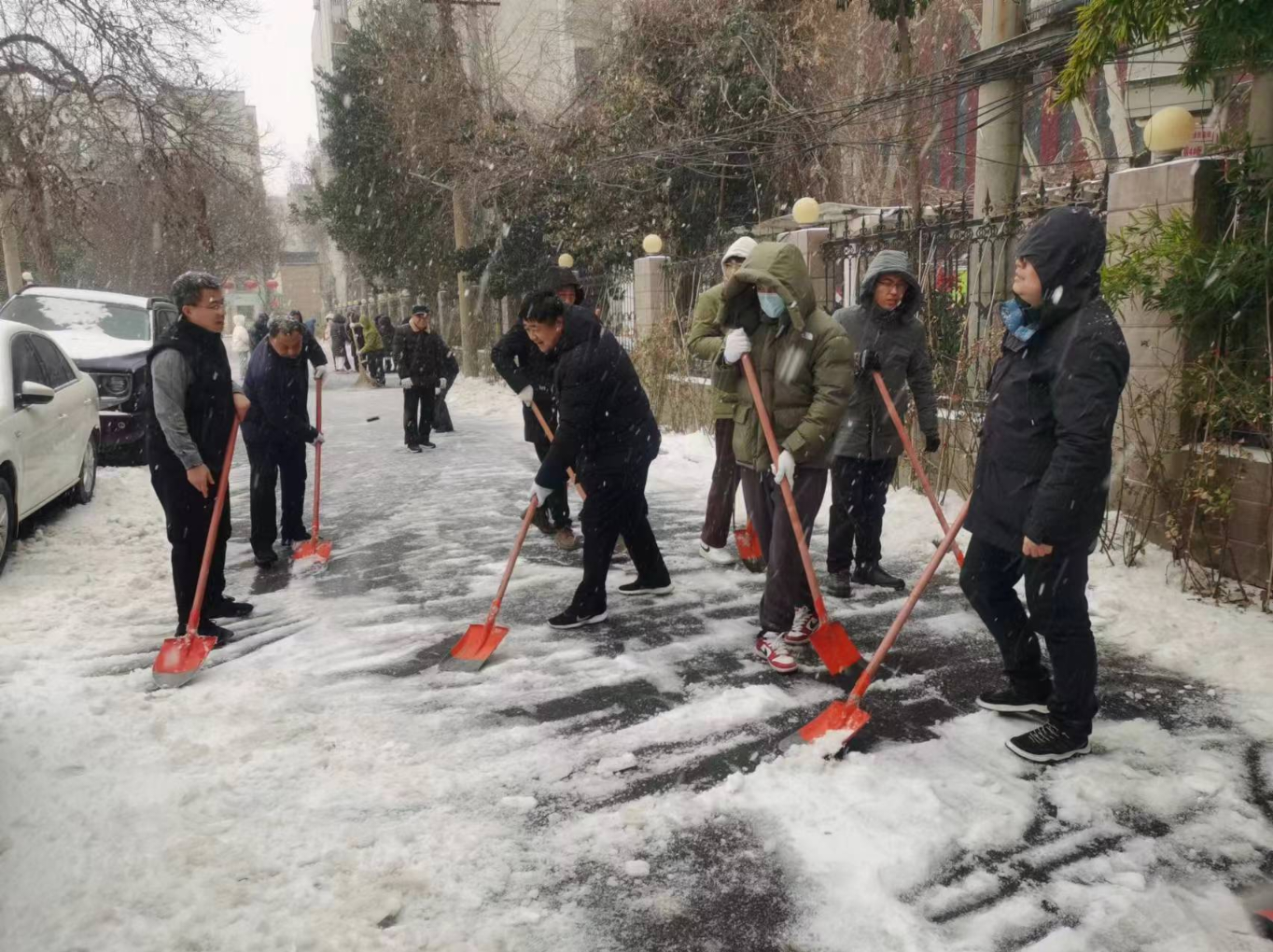 在公司党委书记、董事长尹青亚的带领下,60余名党员职工纷纷拿起铁锹、扫帚等劳动工具,开始对公司周边道路及办公区、家属区主要道路上的积雪和坚冰进行清理。漫天大雪混杂着冰粒拍在职工的脸上、背上、手上,却丝毫没有撼动大家劳动的热情和脚步,凛冽寒风中三五人一组分梯次进行扫雪除冰作业,铲的铲、推的推、扫的扫,大家团结协作、干劲十足,忙碌的身影在皑皑白雪中成了一道道靓丽的风景线。